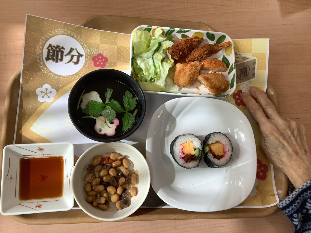 本日は節分でした。昼食には恵方巻きを召し上がって頂き、お腹いっぱいにご満悦でした🤭☆午後には豆まきレクに参加して頂き、スタッフ手作りの鬼の被り物にこれまた手作りの節分豆を使用して、大きな声を出して豆ま...
